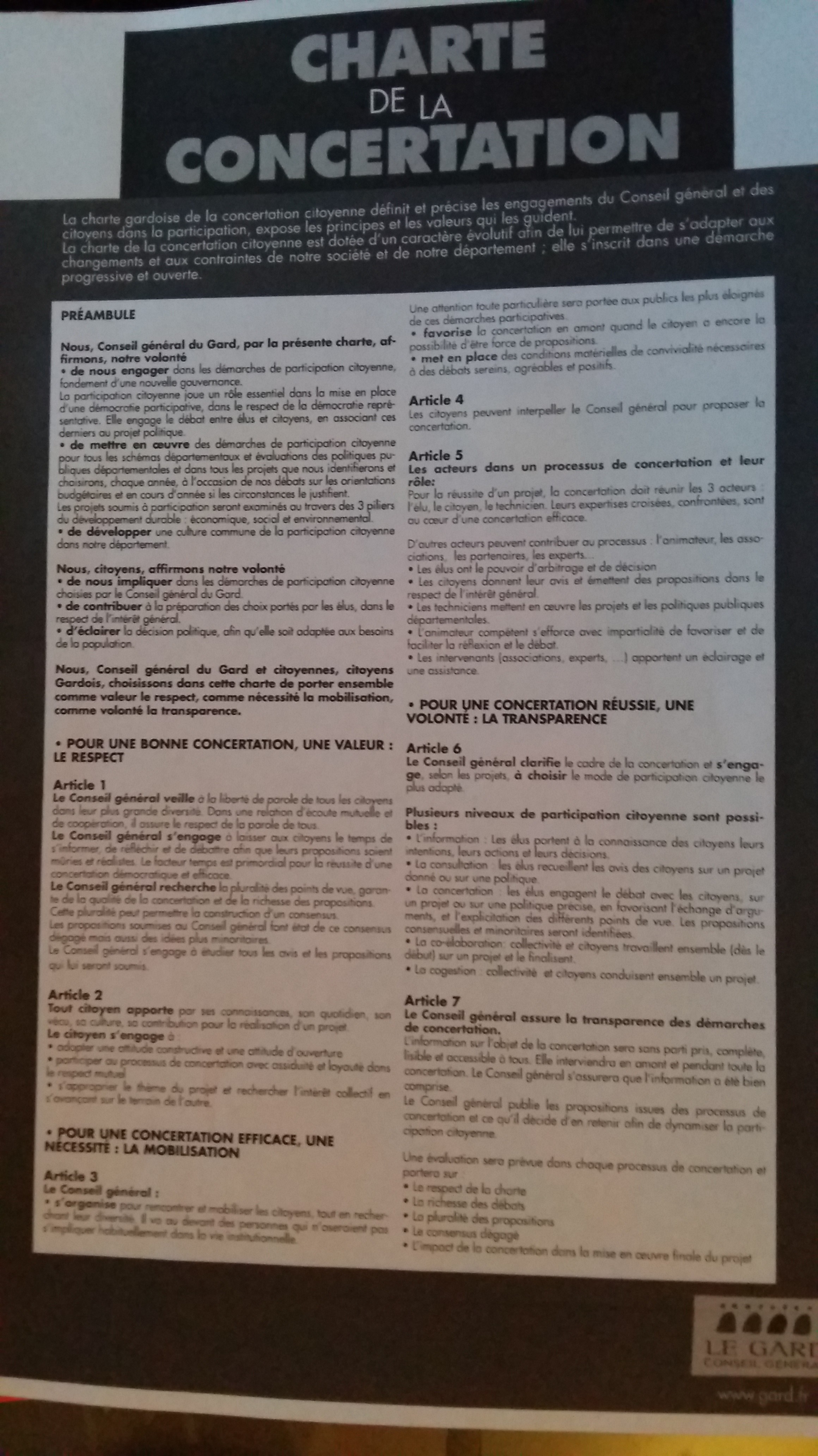 Je vous présente le document suivant intitulé : CHARTE DE LA CONCERTATION ELABOREE PAR LE CONSEIL GENERAL DU GARD.