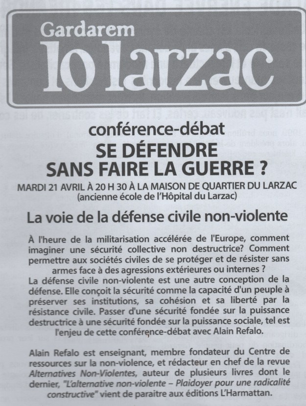 Conférence-débat : Se défendre sans faire la guerre ? – Larzac, 21 avril, avec Alain Refalo