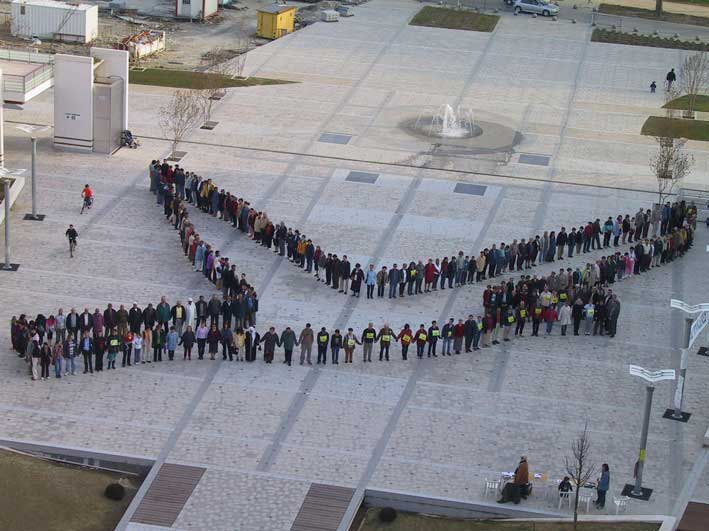 Le 16 avril 2003, le réseau Citoyens pour la paix de Colomiers organise une manifestation d’envergure pour protester contre la guerre en Irak. 350 personnes réalisent une colombe humaine de la fraternité sur la nouvelle place de l’Hôtel de Ville. Une inauguration citoyenne spontanée ! La mobilisation du réseau suscitera la création du Centre de ressources sur la non-violence de Midi-Pyrénées quelques mois plus tard.